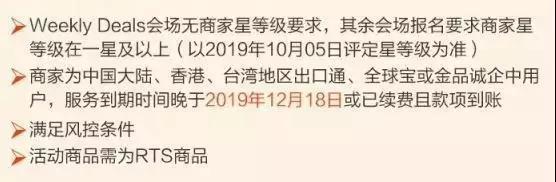 对于招商报名门槛,参加活动商品需是满足风控条件的RTS商品,其中Weekly Deals会场无商家星等级要求,其余会场报名要求商家星等级在一星以上。并且参与此次双11活动的所有商家为中国大陆、香港台湾地区出口通、全球宝或金品诚企中用户。
