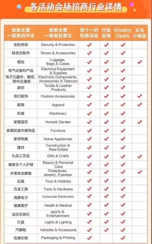 其次,此次活动分为四个横向会场(weekly deals、义乌小商品会场、新品馆、商品榜单)与23个行业垂直会场。并且,商家需要注意的是:一个商品只能上一个会场,因此建议商家合理规划店铺畅销RTS商品进行会场报名。
